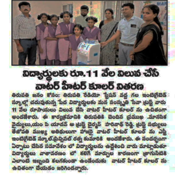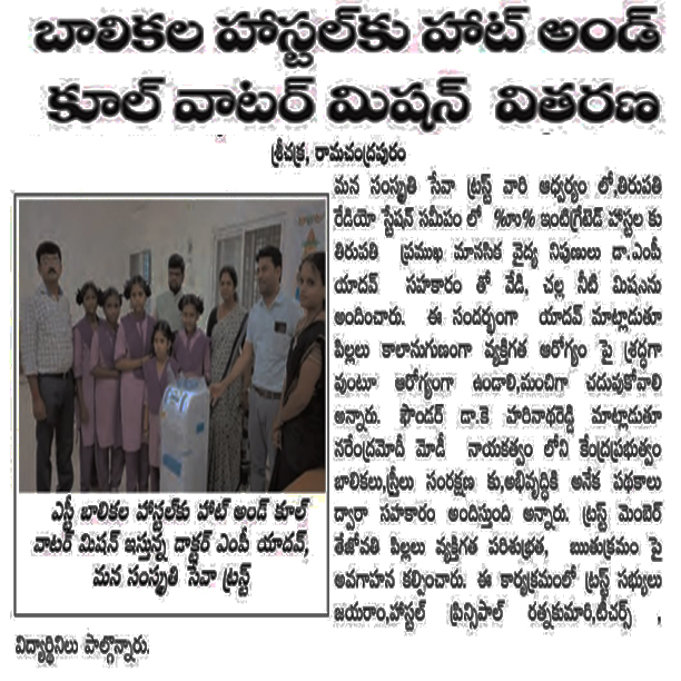 మన సంస్కృతి సేవా ట్రస్ట్ వారి ఆధ్వర్యం లో,తిరుపతి రేడియో స్టేషన్ సమీపం లో ST ఇంటిగ్రేటెడ్ హాస్టల్ కు తిరుపతి లోని ప్రముఖ మానసిక వైద్య నిపుణులు డా.ఎం పీ యాదవ్ గారి సహకారం తో వేడి మరియు చల్ల నీటి మిషన్ ను అందించడం జరిగినది. ఎంపీ యాదవ్ మాట్లాడుతూ పిల్లలు కాలానుగుణంగా వ్యక్తిగత ఆరోగ్యం పై శ్రద్ధగా వుంటూ ఆరోగ్యంగా ఉండాలి,మంచిగా చదువుకోవాలి అన్నారు ఫౌండర్ డా.కె హరినాథరెడ్డి మాట్లాడుతూ నరేంద్రమోదీ మోడీ గారి నాయకత్వం లోని కేంద్రప్రభుత్వం బాలికలు,స్త్రీలు సంరక్షణ కు,అభివృద్ధికి అనేక పథకాలు ద్వారా సహకారం అందిస్తుంది అన్నారు. ట్రస్ట్ మెంబెర్ తేజోవతి పిల్లలు వ్యక్తి పరిశుభ్రత మరియు ఋతుక్రమం పై అవగాహన కల్పించారు. ఈ కార్యక్రమంలో ట్రస్ట్ సభ్యులు జయరాం,హాస్టల్ ప్రిన్సిపాల్ రత్నకుమారి,టీచర్స్ మరియు విద్యార్థిని లు పాల్గొన్నారు...